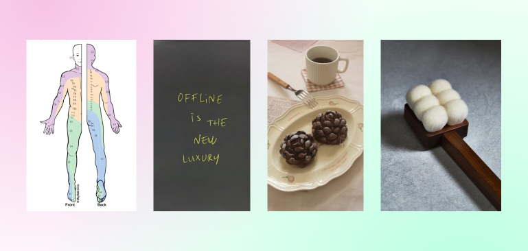 Тихая комната, вы сидите или лежите и медленно отмечаете, где в теле тяжело, где болит, что зажато и не может расслабиться. Выписываете и посвящаете день расслаблению этих мест. Где-то растяжка, где-то массаж, где-то мазью намазать. И даже просто полежать на ровном полчаса-час — это невероятный отдых для тела.