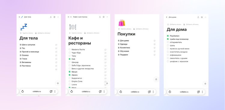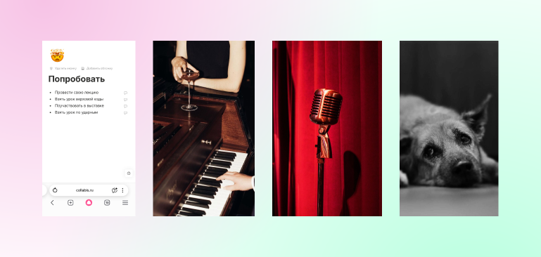 Сколько у вас всего лишнего в галерее на смартфоне? А сколько ссылок и товаров вы сохранили, но так этим и не воспользовались? А всякие полезные материалы и что-то интересное на «почитать»? Все это ложится неосознанным грузом на мозг и где-то фоново тратит оперативную память. Ощущение, что что-то не сделано, упущено. Освободите голову — выгрузите все в Collabis и разместите так, как вам удобно.