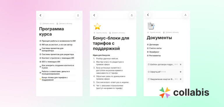 Самое приятное, что инфопродукты можно создавать прямо в Collabis и открывать доступ к ним по ссылке. Выглядеть это будет как обычный сайт в интернете или страница курса на обучающей платформе.