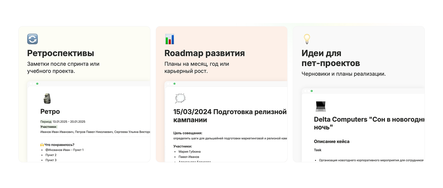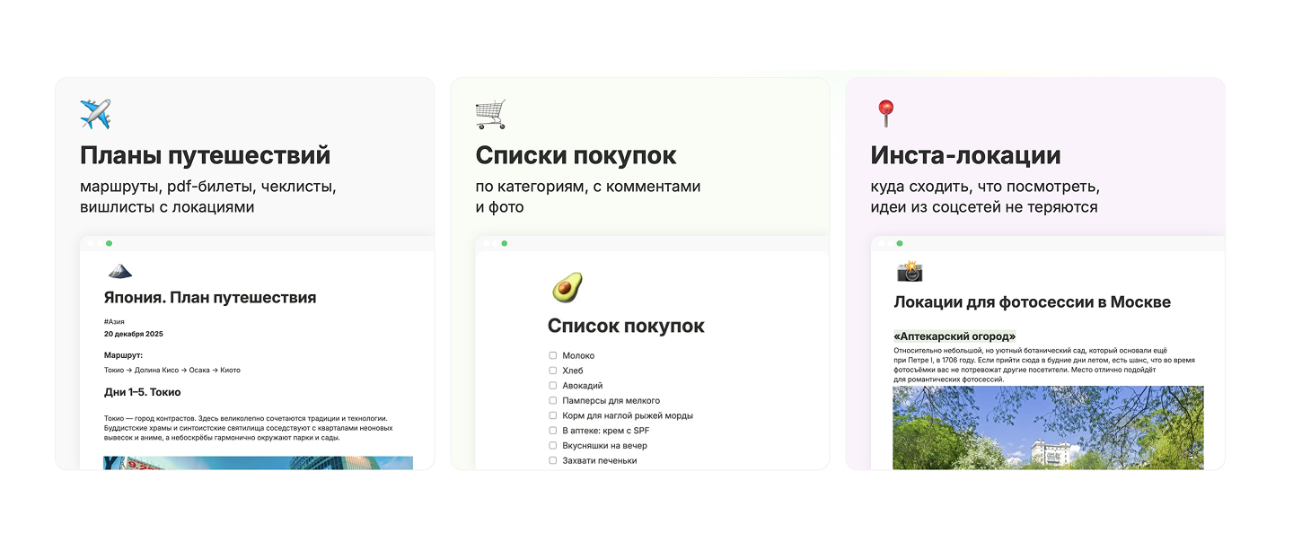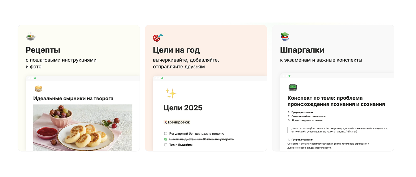 Заметки, списки покупок и фильмов на вечер, идеи для отдыха, планы питания, резюме, бюджет, рецепты, подсказки по хозяйству — что угодно в одном пространстве. Бесплатно, без VPN, в том порядке, который вам подходит.