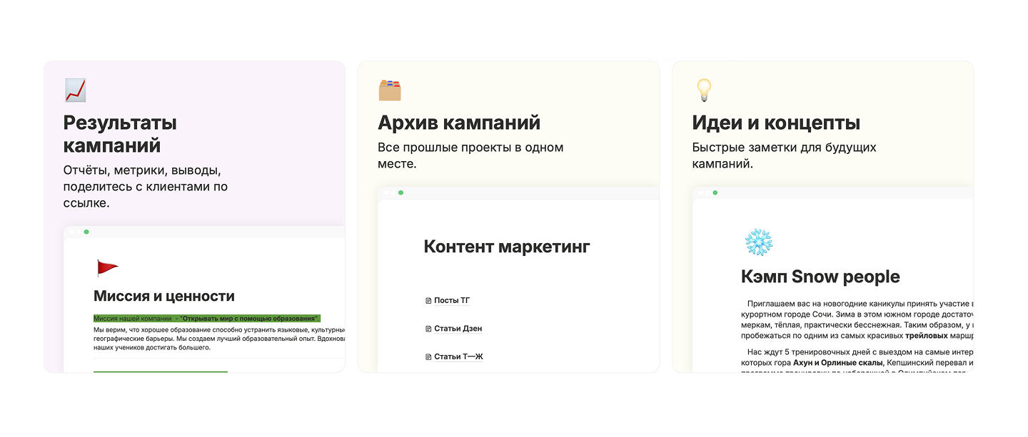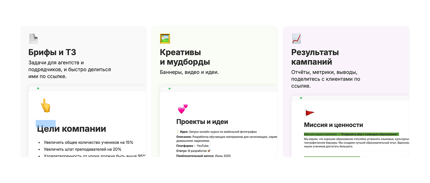 - хранить мудборды, креативы, медиапланы, брифы и ТЗ;