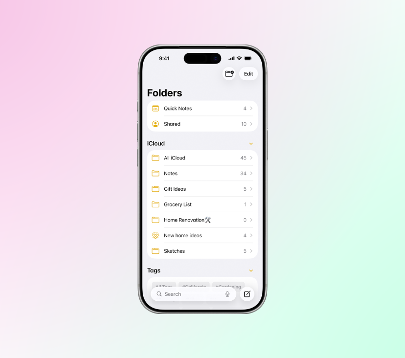 - Поиск. Когда заметок сотни, без поиска — никуда.
