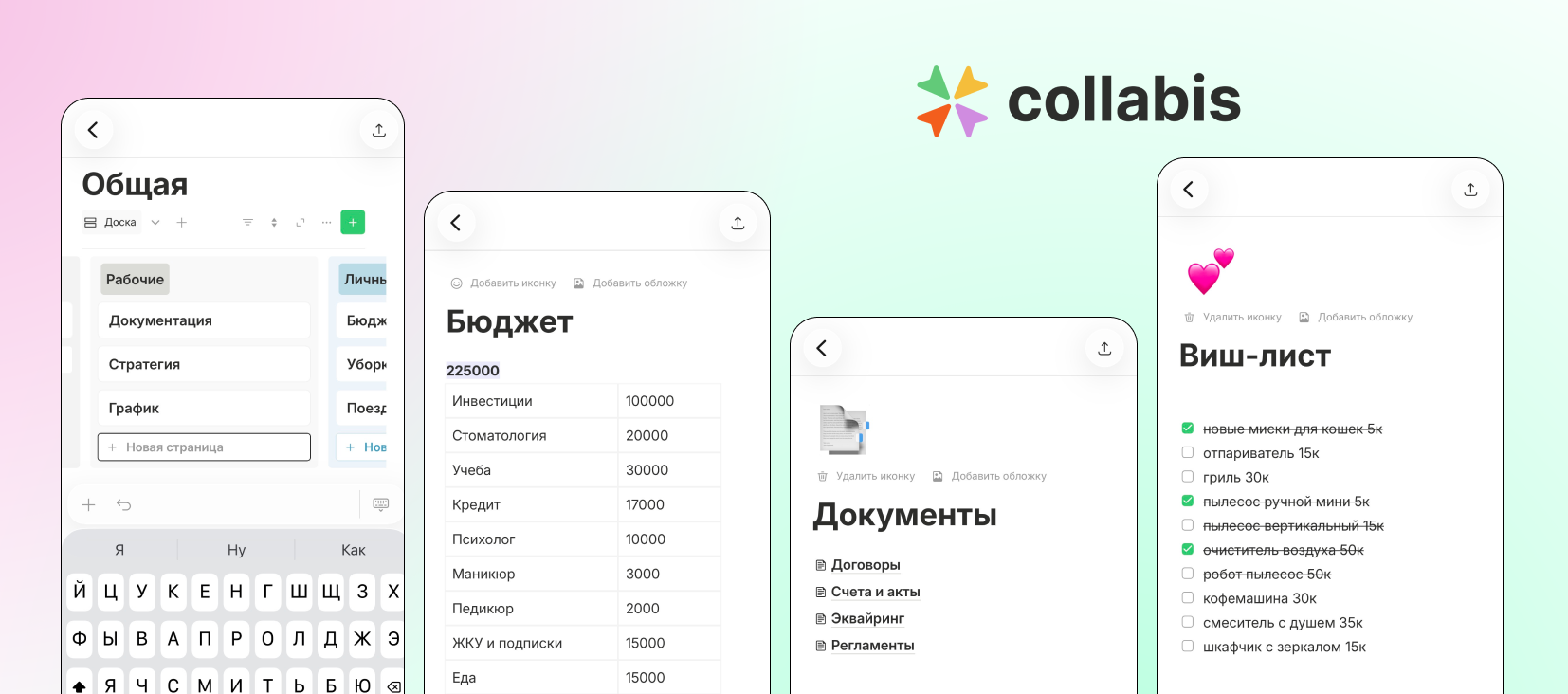 Collabis — рабочее пространство с заметками, задачами и базой знаний. Мобильное приложение для Android и iOS. Блочный редактор: заголовки, списки, цитаты, вложения. AI-помощник помогает генерировать и улучшать текст.